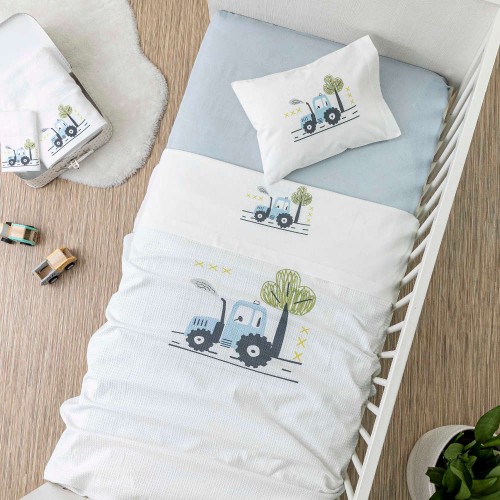 Κουβέρτα κούνιας από ύφασμα πικέ waffle, 100% βαμβακερό, λευκό, με σιέλ ρέλι περιμετρικά και ψηφιακή εκτύπωση, σχέδιο τρακτέρ.